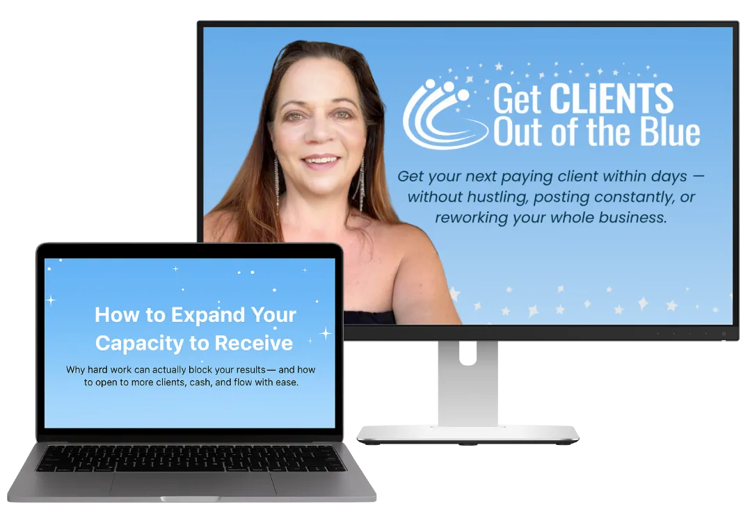 Get Clients Out of the Blue is the bridge between practical action and energetic alignment — a simple, proven method that helps you receive clients quickly, naturally, and with ease.