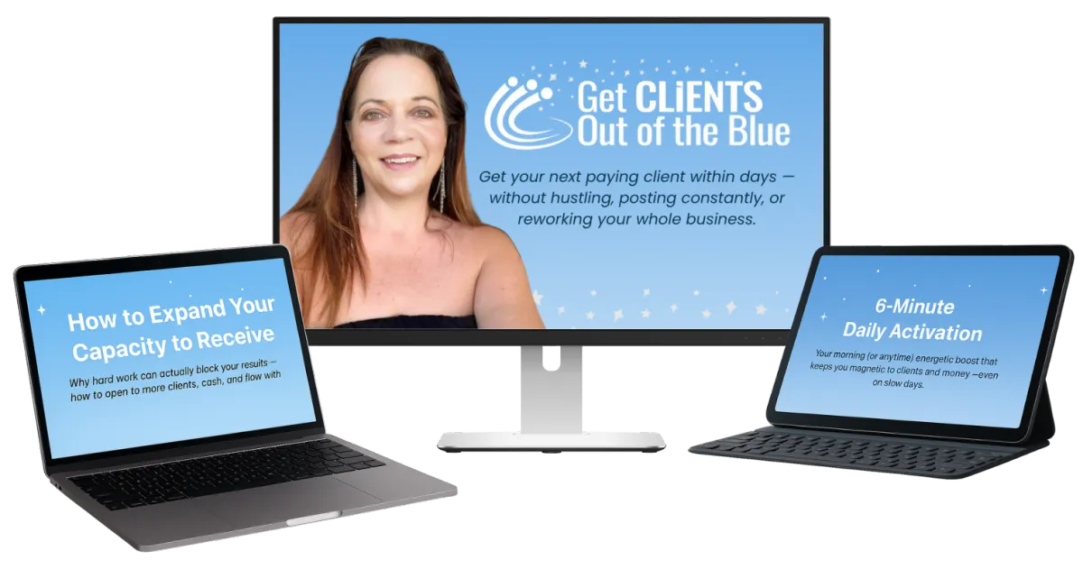 Get Clients Out of the Blue is the bridge between practical action and energetic alignment — a simple, proven method that helps you receive clients quickly, naturally, and with ease.